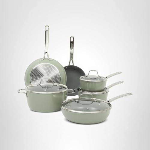 Specification: Sur La Table Kitchen Essentials Cool Commune Hard Anodized 10 Piece PFA Free Ceramic Non stick Interior Forged Durable Aluminum Pots and Pans Cookware Set – Green – Induction Compatible