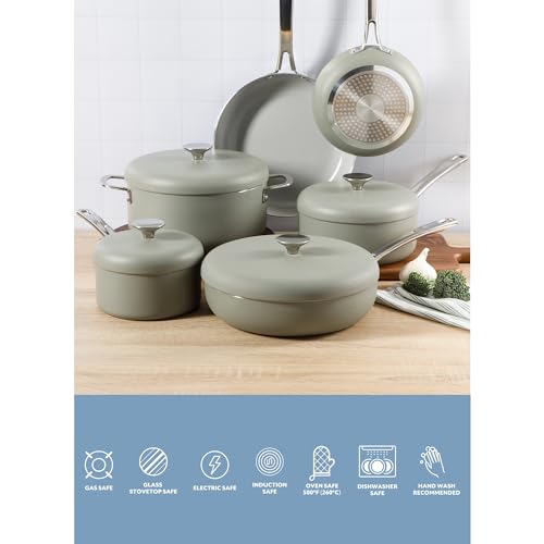 Sur La Table Kitchen Essentials Potluck Porch 10 Piece PFA Free Ceramic Non stick Interior Forged Aluminum Cookware Pots and Pans Set W/Aluminum Lids – Green – Induction Compatible