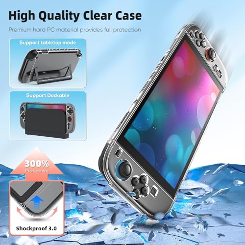 Clear Case & Screen Protector — The hard protective case made of PC material provides comprehensive protection for your switch 2 console and controller, while support tabletop mode. The screen protector is fingerprint resistant, with a hardness of 9H, and can prevent scratches and bumps, providing comprehensive protection for Nintendo games. You can freely pair it with 8 thumb grills.