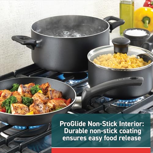 Cooking and cleaning made easy with T-fal Essentials Non-stick cookware, ensuring reliable results when preparing meals for the whole family. Superior Pro-Glide PTFE non-stick withstands the rigors of everyday cooking. Thermo-Spot technology shows when T-fal pans are perfectly preheated to start cooking. Enjoy cooking with this versatile cookware: The set includes 8 inch and 9.5 inch fry pans, 1 quart saucepan with lid, 2 quart saucepan with lid, 5 quart dutch oven, and 2 nylon tools. ProGlide Non-stick Interior: Experience easy food release and cleanup, allowing you to cook with confidence and enjoy delicious meals without the hassle of stuck-on food. Also, enables healthy cooking with little to no oil. Perfectly Seared Meals: With even heat distribution and Thermo-Spot® Technology, our unique heat indicator that turns solid red to show when pans are properly preheated to start cooking, you can achieve delicious and expertly cooked results. Ultimate Comfort and Control: Featuring a comfortable handle for sturdy and secure grip while cooking and vented glass lids that maintains visibility while keeping heat and moisture locked in for delicious, juicy results. Make cooking a breeze with measuring marks on select pots. Versatile cookware: Essentials cookware is oven safe up to 350°F and compatible with all cooktops, excluding induction, making meal preparation a more enjoyable experience. Featuring a dishwasher safe design that makes everyone’s least favorite part of cooking easier. Limited lifetime warry.