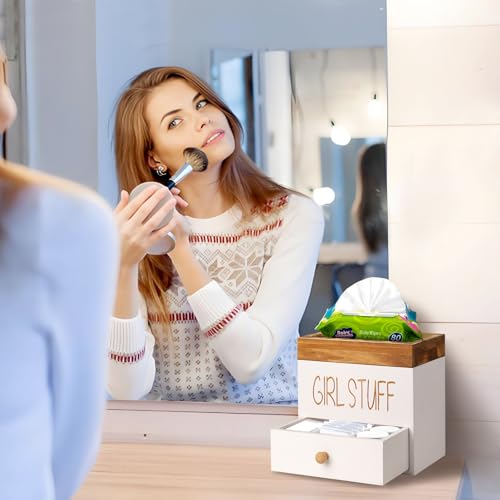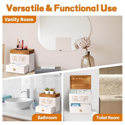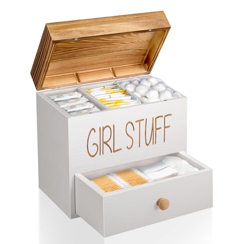 【Stylish & Practical for Any Room】 Our pad and tampon organizer for bathroom is functional and attractive. Crafted with subtle carving of the word “GIRL STUFF” detailing, this tampon storage box combines functionality with decor-friendly elegance. The rustic brown finish and practical design allow this tampon storage container to enhance any space—whether in the bathroom, bedroom, toilet or vanity. The grooved lid top serves as a handy tray for small items like jewelry or phone, making this bathroom canister as practical as it is beautiful.