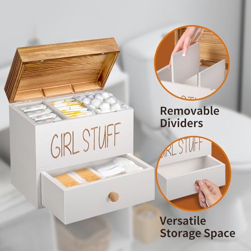 【Elegant & Discrete Tampon Holder with Lid & Drawer】 This beautiful feminine product organizer keeps your girl stuffs neatly organized and within easy reach. Our tampon box not only declutters your space but also adds a touch of elegance to any room. With 3 spacious compartments and 2 removable dividers, this shark week period box allows customizable storage for bathroom accessories like tampons, cotton swabs, pads, liners and more. The hinged lid offers essential protection against dust and moisture, while the hidden bottom drawer conveniently stores wipes and other personal items—all while blending seamlessly with your bathroom decor.