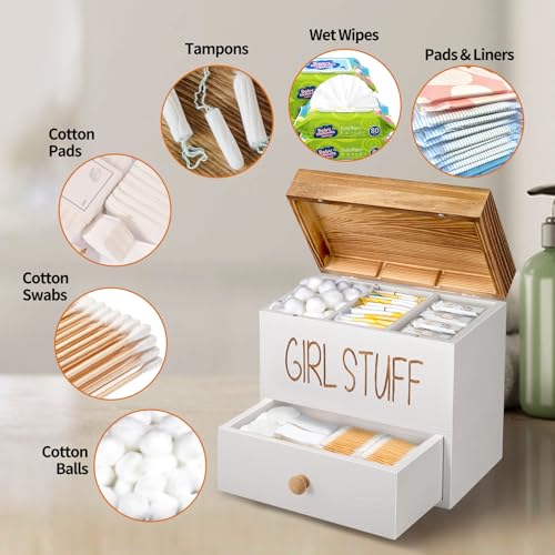 Tampon Holder for Bathroom, Feminine Product Organizer Wood Pad and Tampon Container Storage Box with Drawer for Shark Week Girl Stuff – White