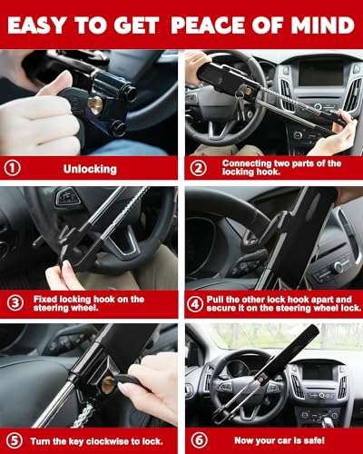 A+ GRADE ANTI-THEFT LOCK:Car wheel lock is made of top-grade steel, featuring a high-strength solid locking beam that makes it difficult for thieves to break. The pure copper lock core is durable and provides secure anti-theft protection! The precise double spring crescent lock sub-type encoding key is specially designed to prevent professional thieves and mutual open rate!The overall body of the anti-theft steering wheel lock is treated with a plastic dipping process that will not damage you steering wheel.