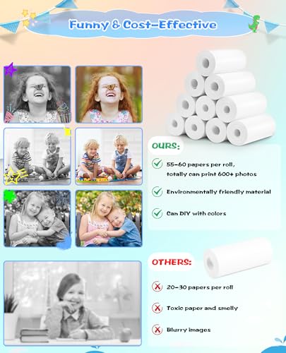 10 Rolls Print Paper: Keep your kids entertained for hours with these rolls of instant camera refill print paper. Each roll measures 2.24in x 18.68ft, enough to print 55-60 photos per roll, totally this pack could print about 600 photos