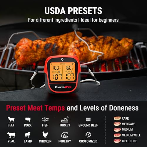Specification: ThermoPro 450-ft Wireless Meat Thermometer Digital, Bluetooth Meat Thermometer Wireless for Meat Steak, Smoker Thermometer with Dual Meat Probe, Cooking Food Thermometer for Grilling and Smoking
