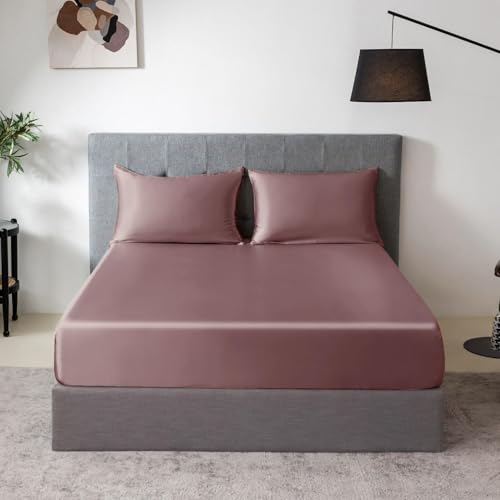 THXSILK 100% Mulberry Silk Fitted Sheet Set, 7A+ Silk 3 Pieces Bed Sheets, Breathable, Smooth, 16 Inch Deep Pocket Fitted Sheet, 2 Pillowcases – Purple, Full