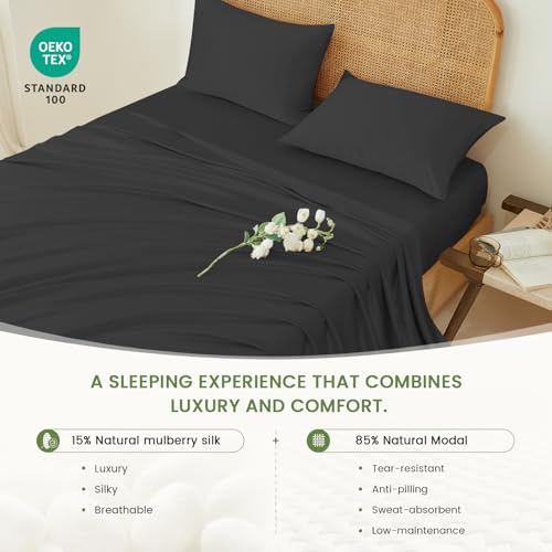 MULBERRY SILK & MODAL: Sheets set is made of 15% natural mulberry silk and 85% modal, which is lightweight, ultra soft, smooth, breathable, and body-hugging, maintains the balance of skin moisture. Pure silk is delicate and easy to damage, and fabric with modal ingredient can make the product last longer and is a cost-effective choice.