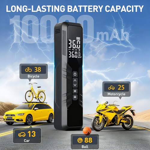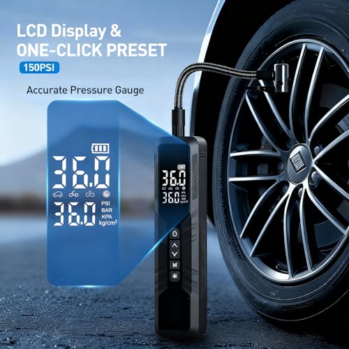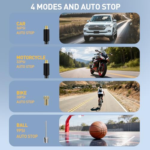【5 Smart Inflation Modes】Cordless air pump supports 5 preset modes for cars, motorcycles, bicycles, balls, and other inflatables. With up to 150PSI pressure output, it’s an essential tool for travel, camping, road trips, or emergency situations.