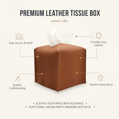 Be the first to review “Tissue Box Cover Holder, Square with Bottom Belt by Carrot’s Den – PU Leather Decorative Organizer for Tabletop, Bathroom, Car, Office | Camel”