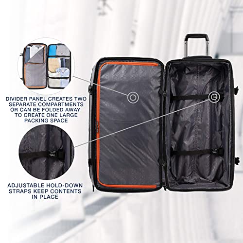 The 30″ Drop Bottom Rolling Duffel is part of the Travelpro BOLD™ Collection. Perfect for the jet-set adventurer, the BOLD by Travelpro 30″ Drop Bottom Rolling Duffel. Made with rugged high-density polyester fabric with water repellent coating. Divider panel with zip closure. Two side pockets to separate clothing, shoes or accessories. Two interior wallet credit card slots. Front zip pocket for quick-access items such as phones, cords, and snacks. Compression straps adjust to the size of your load. Retractable, telescoping handle. Ball-bearing wheels creates a smooth ride on any surface.