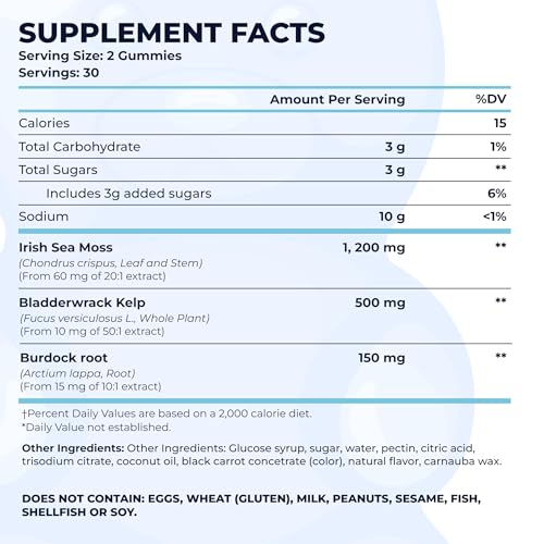 Each 2-gummy serving delivers a potent blend of extracts equivalent to 1,200 mg of Irish Sea Moss, 500 mg of Bladderwrack Kelp, and 150 mg of Burdock Root for comprehensive daily support