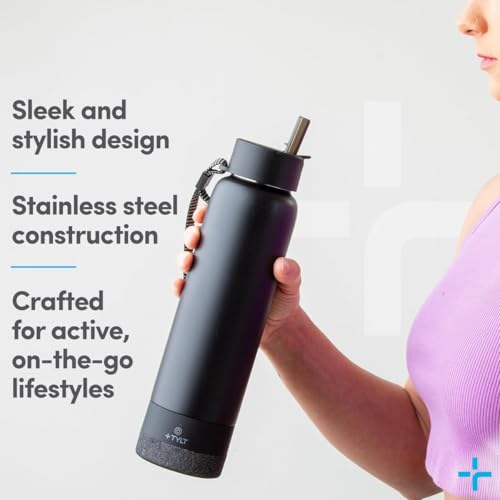 TYLT Smart Water Bottle with Bluetooth Speaker, Wireless Stainless Steel Insulated Travel Tumbler with Flip Straw, Rechargeable, Portable, Double Layered, 24oz (Black)