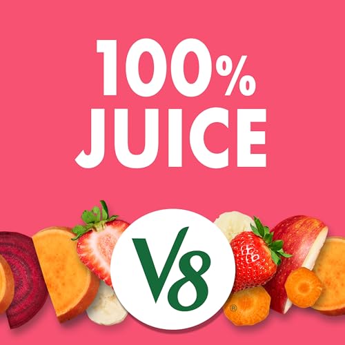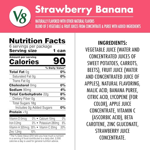 Experience a delicious blend of vegetables and fruit with V8 Strawberry Banana 100% Fruit and Vegetable Juice. Combining the flavors of sweet strawberry and creamy banana, this strawberry banana juice gives you the nutrition of vegetables blended with the right amount of fruit for a light, sweet taste. Each can of 100% juice is made with the juices of fruits and vegetables, including strawberries, bananas, red apples, beets and carrots. The result is a vegetable and fruit juice blend with 25% less sugar than leading juice brands* and 2 combined servings of veggies and fruit in every 8 fl oz, plus Zinc and Antioxidants A and C. Formerly known as V8 V-Fusion, V8 100% Fruit and Vegetable Juice is gluten free and non-GMO with no sugar added** and no artificial sweeteners. Like the classic V8 juice, this fruit and vegetable drink is an easy way to get the refreshing boost you need to help fuel your day. Enjoy it as a breakfast drink, afternoon snack, or post workout drink. (*Per 8 fl oz: Leading juice brands, 25.4g; V8 Strawberry Banana, 18g **Not a low calorie food; see nutrition panel for sugar and calorie content)