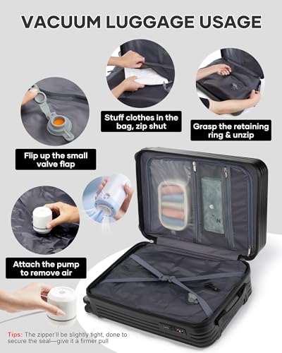 Vacuum Carry on Luggage with TSA lock for Men & Women, 20 Inch Medium Size Overhead Luggage Airline Approved,Hard Shell Rolling Suitcase with Spinner Wheels, Lightweight Travel Suitcase(Black)