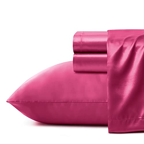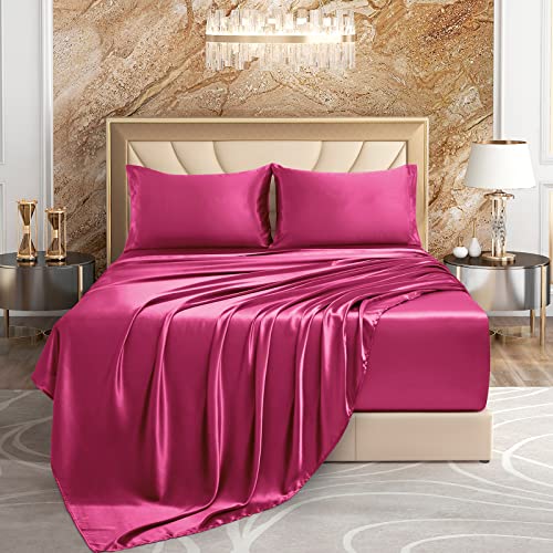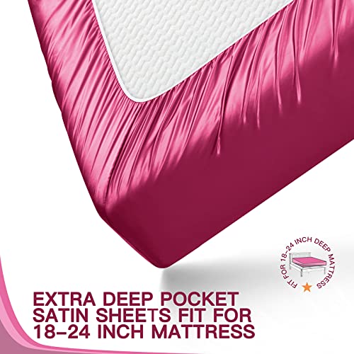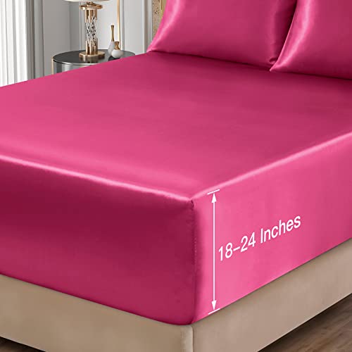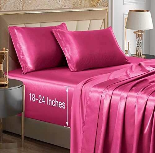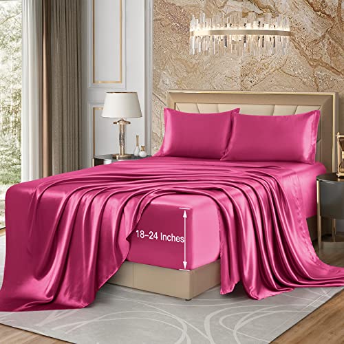 VACVELT 4pcs Extra Deep Pocket Sheets Full Size Bed Set, Hot Pink Satin Sheet Set Fit 18-24 Inch Deep Pocket Mattress, Silky & Luxury Bedding Set Soft & Ultra Deep Fitted Sheet Set
