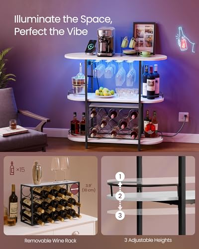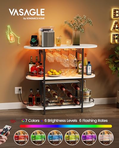 VASAGLE Bar Cabinet with LED Lights and Power Outlets, Freestanding Coffee Bar Wine Cabinet, Wine Rack, Glass Holder, Mini Bar for Liquor and Glasses, Kitchen, Dining Room, Rustic White ULWR007W01S