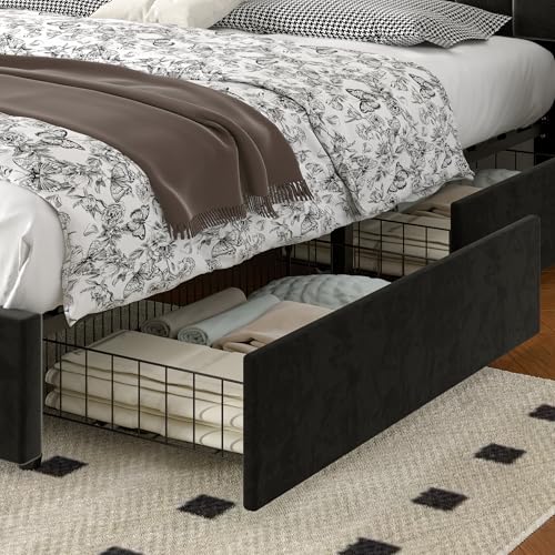 Specification: VECELO Full Size Upholstered Bed Frame with 4 Drawers and Headboard, Velvet Platform Storage Bedframe, Wooden Slats Support, No Box Spring Needed,Black