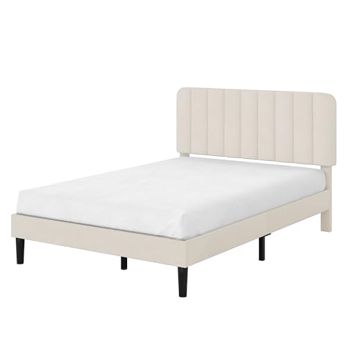 Specification: VECELO Queen Size Bed Frame with Upholstered Headboard, Velvet Platform Bedframe Mattress Foundation, Strong Wood Slat Support, No Box Spring Needed,Velvet Beige