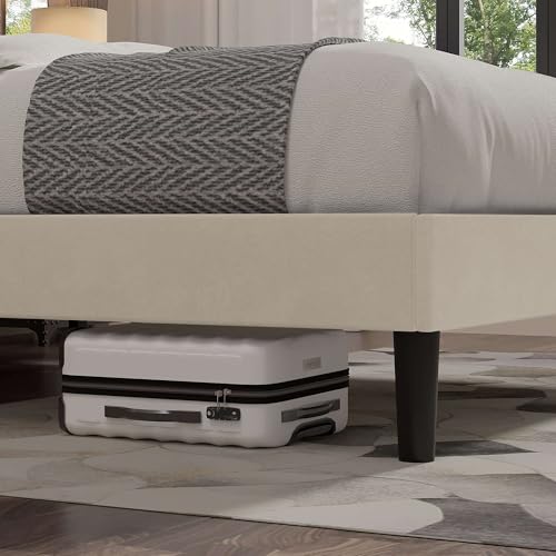 [Sturdy Structure] This beige queen bed frame with headboard boasts a sturdy metal frame structure, supported by a series of evenly-spaced solid wood slats and extra 6 center support legs. Designed to accommodate queen size bed frames, it offers dense and strong support, capable of holding weights of up to 650lbs.