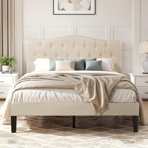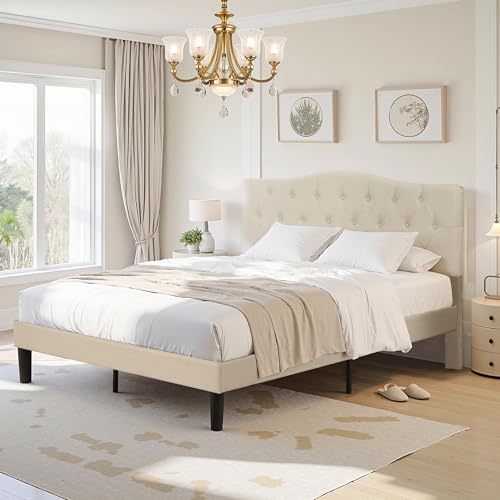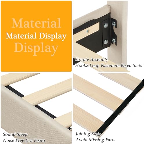 Specification: VECELO Queen Size Platform Bed Frame with Fabric Upholstered Headboard and Wooden Slats Support, No Box Spring Needed/Easy Assembly,Beige