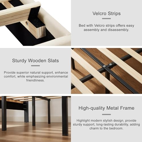 【Durable & Silent】Constructed with a sturdy metal frame and 12 durable wooden slats, this platform bed strong support up to 800 pounds, a perfect box spring replacement. Its robust Velcro and noise free strips ensure the wooden slats are securely fastened, minimize friction noise and provide a peaceful sleep environment.