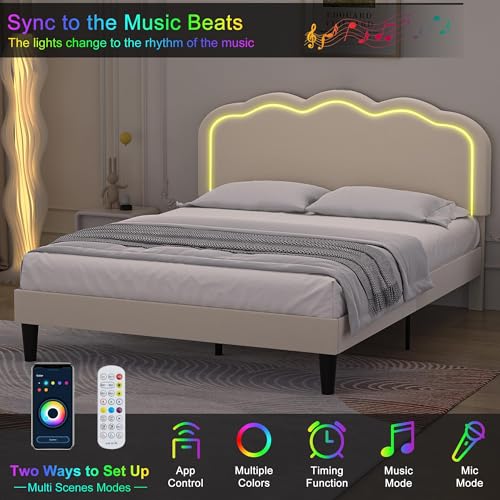 【Enjoy Wonderful Bedroom】 With Built-in LED light in the upholstered headboard, this led bed frame queen offers over 16 million colors, more than 20 preset lighting effects (brightness, flashing, wave), and various modes (music, microphone, timer mode, etc.) Create the perfect ambiance for any mood or occasion from soft reading light to vibrant party colors.
