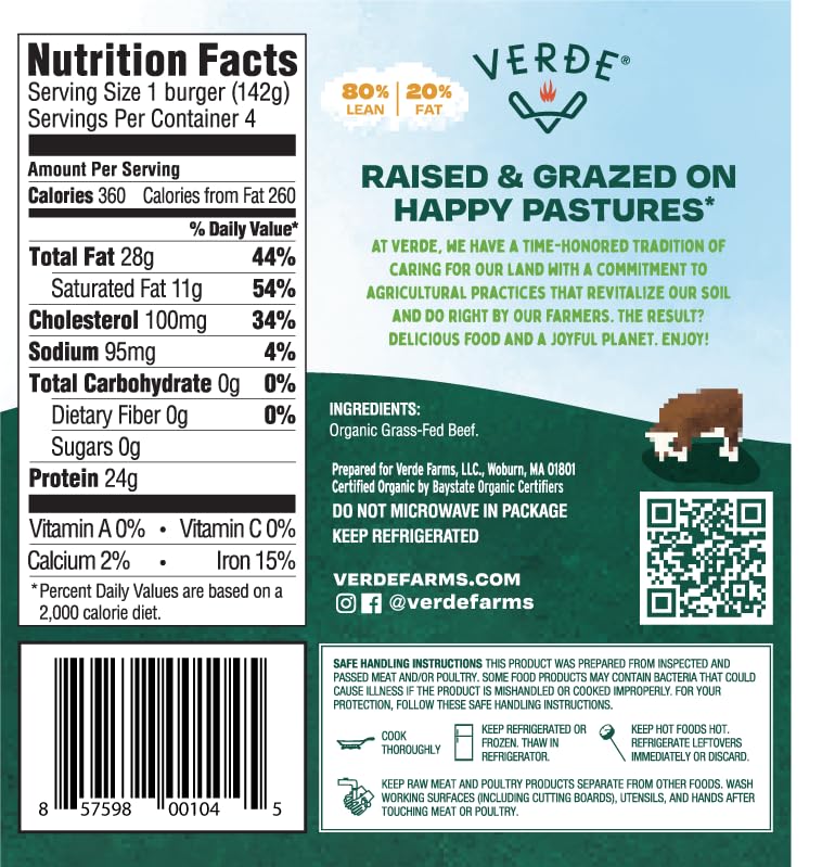 Specification: Verde Farms, Beef Burgers, Organic, Grass-Fed, 1.25 lb, Pack of 4
