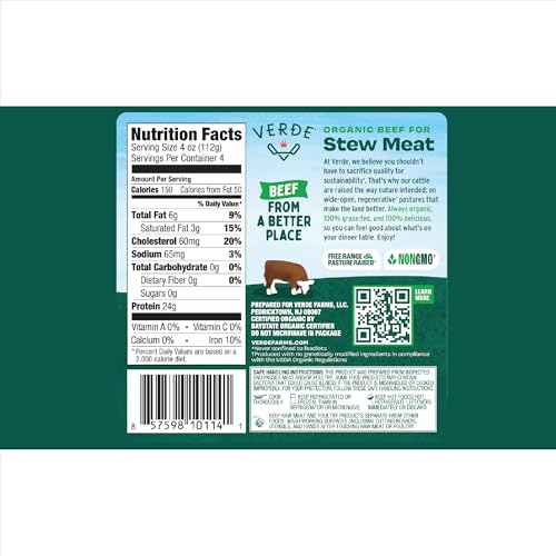 Specification: Verde Farms, Beef Stew Meat, Organic, Grass-Fed, 1 lb