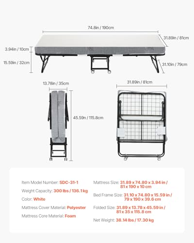Specification: VEVOR 31 in x 75 in Folding Bed with 4 in Mattress, Twin Size, White, Metal Frame & Memory Foam Mattress, Portable Rollaway Bed, 300 lbs Weight Capacity, Adult, Guest