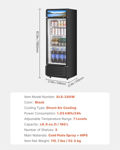 Specification: VEVOR Commercial Merchandiser Refrigerator, 6.9 CU.FT Glass Door Display Refrigerator, Beverage Refrigerator Cooler Merchandiser with Adjustable Shelves, Soft LED Light, Customizable Lightbox, Black