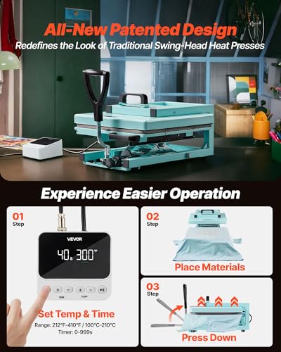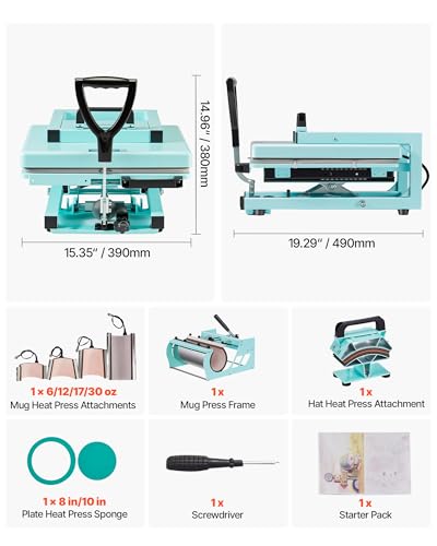 Specification: VEVOR Hybrid Heat Press, 15 x 15 inch, 8-in-1 Multifunction, Heat Up Fast and Even, All-New Patented Design, Easy to Control, Sublimation Press Machine for T-Shirts/Tumblers/Caps/Plates, Light Green