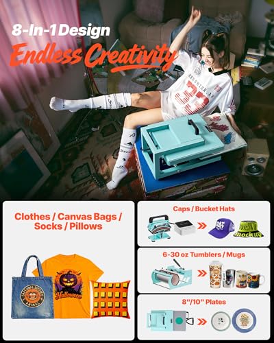 Get More, Spend Less: This 8-in-1 hybrid heat press machine handles T-shirts, hoodies, bags, pillows, caps, mugs, etc. Save space and cost with one machine. Ideal for creating presents for family or clients, blending creativity and practicality