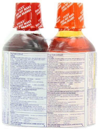 Power through your day with the non-drowsy, multi-symptom cold and flu relief of Vicks DayQuil Cold & Flu Multi-Symptom Relief Liquid. For cough due to minor throat and bronchial irritation, sore throat, headache, minor aches and pains, fever and nasal congestion.; NyQuil Cold & Flu Nighttime Relief Liquid is available in three flavors: original, cherry and vanilla cherry swirl.; When using DayQuil or NyQuil products, carefully read each label to insure correct dosing. Use as directed. Keep out of reach of children.; DayQuil & NyQuil Cold & Flu Twin Pack – (2) 12 Oz bottles.