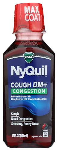 Don’t let your irritating cough and congestion keep you up. Vicks NyQuil Cough DM & Congestion delivers max strength nighttime relief for your worst cough symptoms so that you can sleep. Controls cough, provides relief for sinus and nasal congestion, helps with sneezing and runny nose.