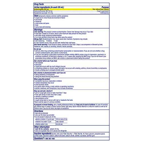 Directions: adults & children 12 yrs & over – 30 mL every 6 hrs, children 4 to under 12 yrs – Ask a doctor, children under 4 yrs – do not use.