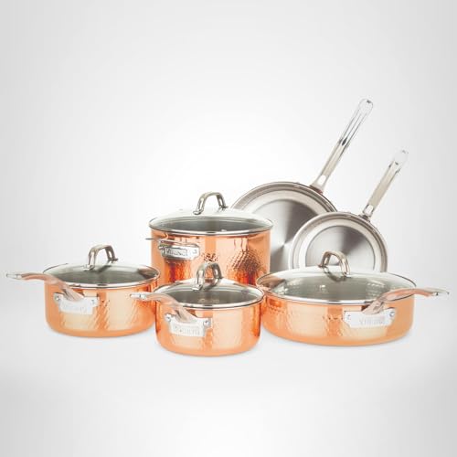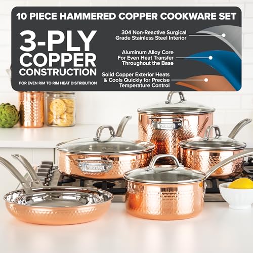 Specification: Viking 3-Ply Pots and Pans Set, 10 Piece Copper Kitchen Cookware with Glass Lids, Hammered Copper