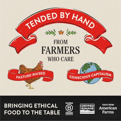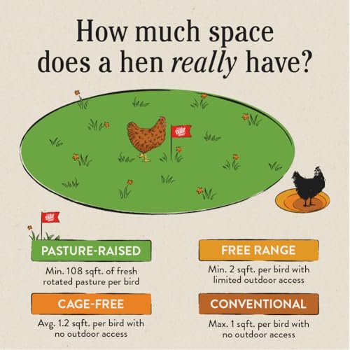 PASTURE RAISED: Our hens enjoy at least 108 sqft. of pasture each with plenty of fresh air and sunshine, and freedom to forage through rotated pastures, feasting on a natural buffet of grasses. Just as Mother Nature intended.