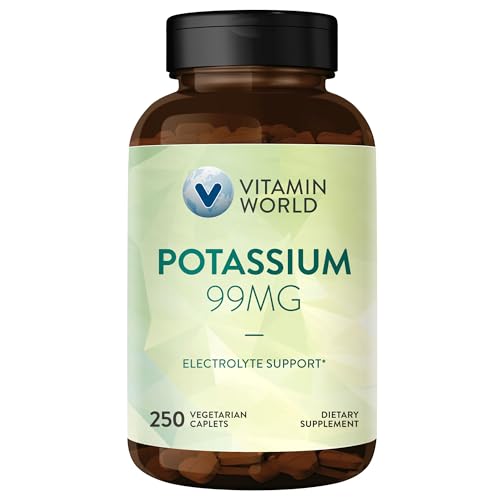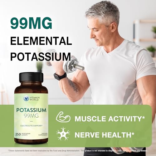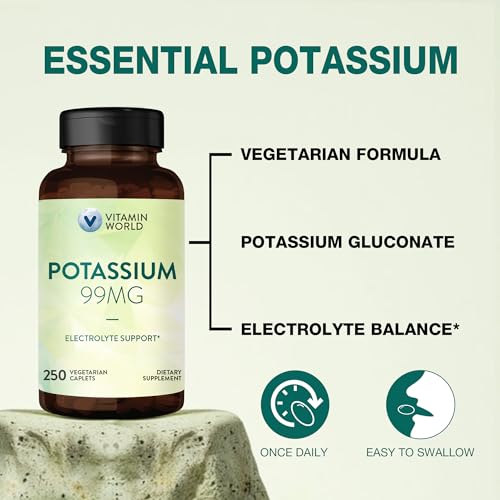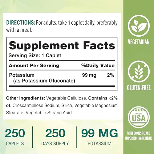 Specification: Vitamin World Potassium 99 mg – 250 Vegetarian Caplets, Potassium Gluconate Supplement for Electrolyte & Muscle & Nerve & Heart Support, Gluten-Free, Once Daily, 250 Days Supply