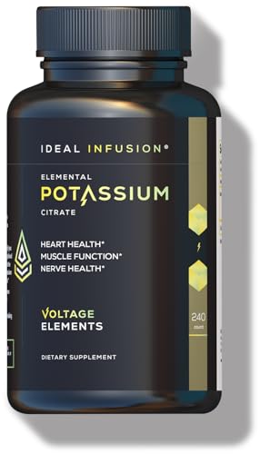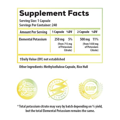 Specification: Voltage Elements Potassium Citrate 1430mg – Heart & Kidney Health, Electrolyte Balance, Nerve Function – Elemental Potassium 500mg (240 Capsules) Vegan