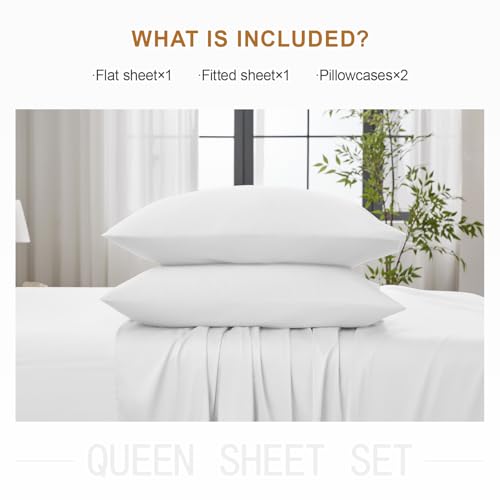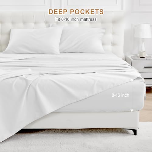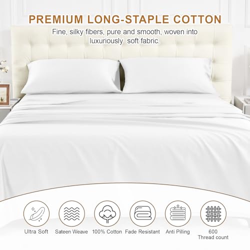 Warmstar 100% Cotton Queen Sheet Set,600 Thread Count Cotton Bed Sheets Sateen Soft Cotton Queen Size Sheet Set Deep Pocket, 4 Pc Bed Sheet Set -1 Flat Sheet, 1 Fitted Sheet,2 Pillowcases,White