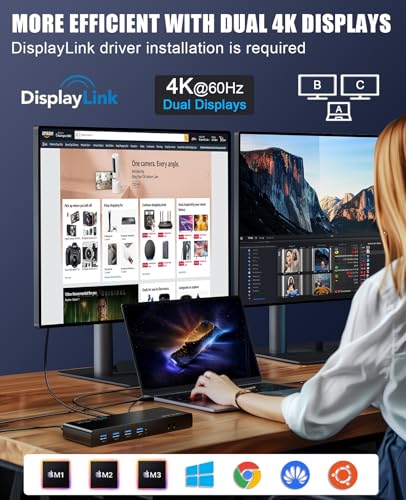 Compatibility – This displaylink docking station compatibility Windows 11, 10, 8.x, and 7, Apple M1/M2/M3/M4 and Intel Macs ( macOS 10.14+ ) and ChromeOS 100+. NOT compatible with Linux. DisplayLink drivers need to be download and installed on the laptop.