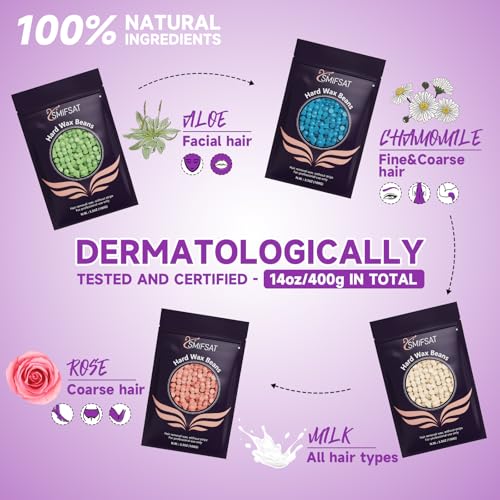 【❤️Natural ingredients, gentle care】Hair removal wax beans are selected from natural beeswax or plant wax ingredients, and the formula is mild and non-irritating. The set contains 4 packs of natural hard wax beans with different fragrances (chamomile, rose, aloe vera, milk, a total of 14.1 ounces), with natural plant extracts before and after care spray, dermatologically tested and certified, suitable for all skin types, sensitive skin can also be used with confidence.