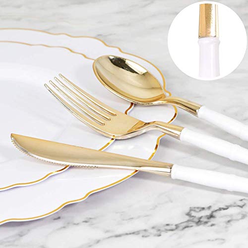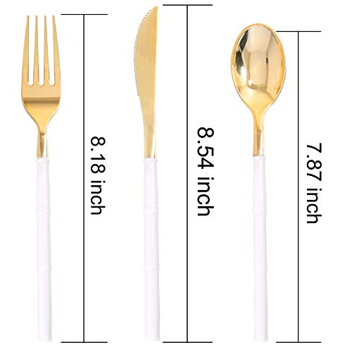 BAMBOO LOOK DESIGN: Modern gold plastic cutlery with bamboo patterned handle, the perfect match of gold and white, bring extreme elegance to the party, and improve your taste from the details. Gold disposable utensils with ergonomic handle: for comfortable grip to lift food