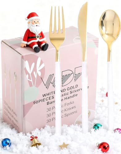 Specification: WDF 90Pieces Gold Plastic Silverware-Gold Plastic Cutlery with White Handle- Heavy Duty Thanksgiving Christmas Silverware Include 30Forks, 30 Spoons, 30 Knives for Parties