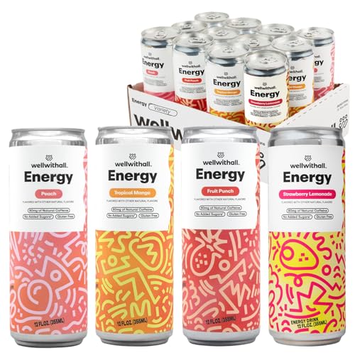 Specification: WellWithAll Energy Drink Variety Pack – Strawberry Lemonade, Fruit Punch, Tropical Mango, and Peach Flavors – Caffeine from Tea – With Vitamin C – Lightly Sparkling Beverage – Fruit & Veggie Juice Blend – 12 Oz (Pack of 12 – 3 Cans of Each Flavor)
