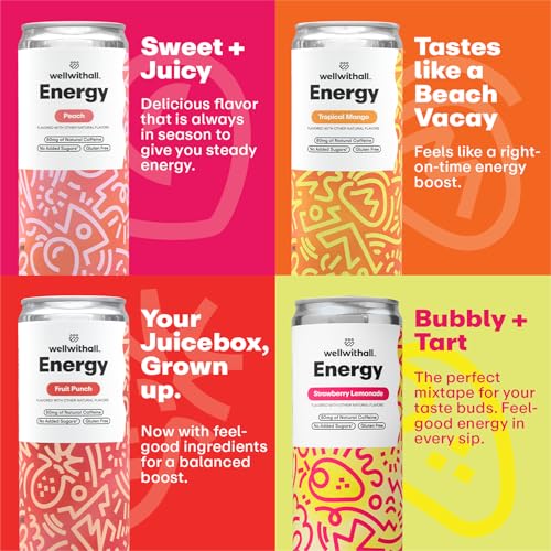 WellWithAll Energy Drink Variety Pack – Strawberry Lemonade, Fruit Punch, Tropical Mango, and Peach Flavors – Caffeine from Tea – With Vitamin C – Lightly Sparkling Beverage – Fruit & Veggie Juice Blend – 12 Oz (Pack of 12 – 3 Cans of Each Flavor)