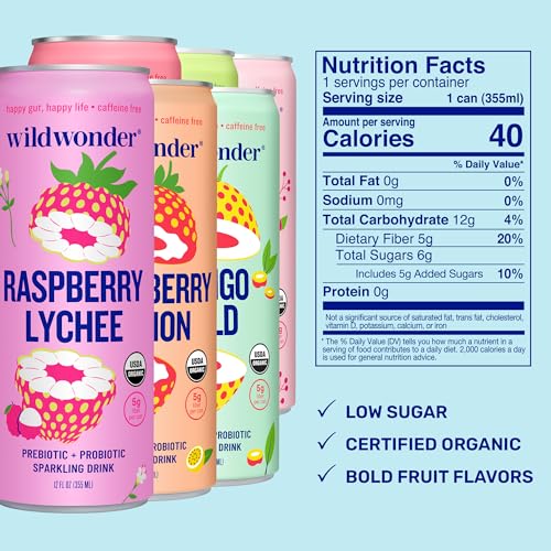 Specification: wildwonder Sparkling Probiotic Juice Drink 18pk, w/Gut Health & Immunity Support, 5g Prebiotic Fiber, Live Probiotics, Organic, Vegan, Low Sugar, Sampler Pack, 6 Flavors, Seen on Shark Tank