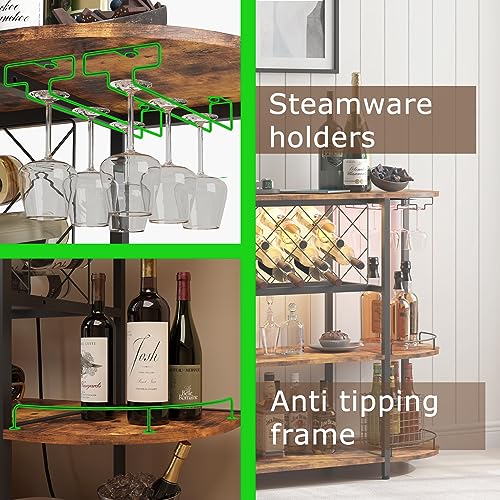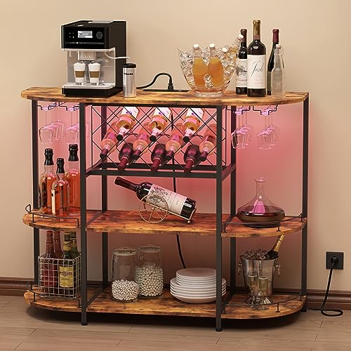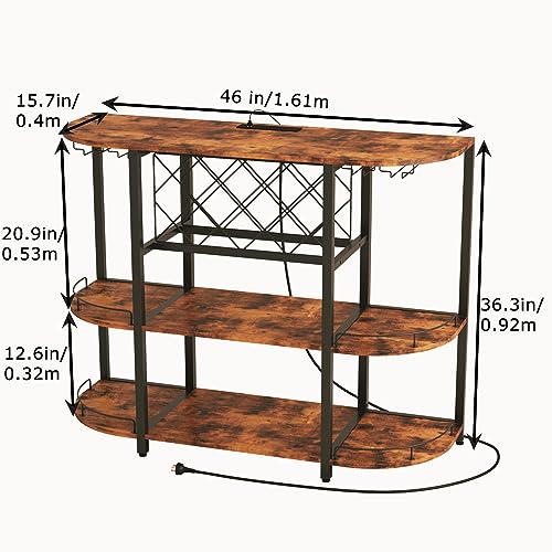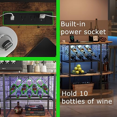 Wine Cabinet Bar Cart Table with Power Socket and LED Light, Three Tiers Coffee Bar Table Wine Rack Liqour Bar with Large Storage for Home Kitchen (Retro Brown)