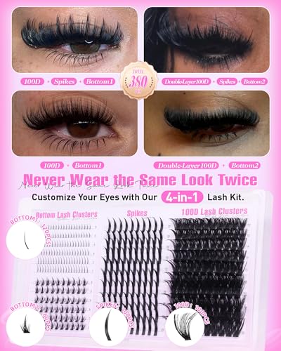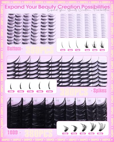 380PCS 4 Styles Lash Clusters: 4 pro-grade styles lashes clusters in 1 box: 2 Styles Feather-light 5-7mm bottom lashes for subtle lower-line definition.13-21mm spikes lash clusters,and velvety-soft 12-20mm 100D volume eyelash clusters.No more needed—everything’s here.